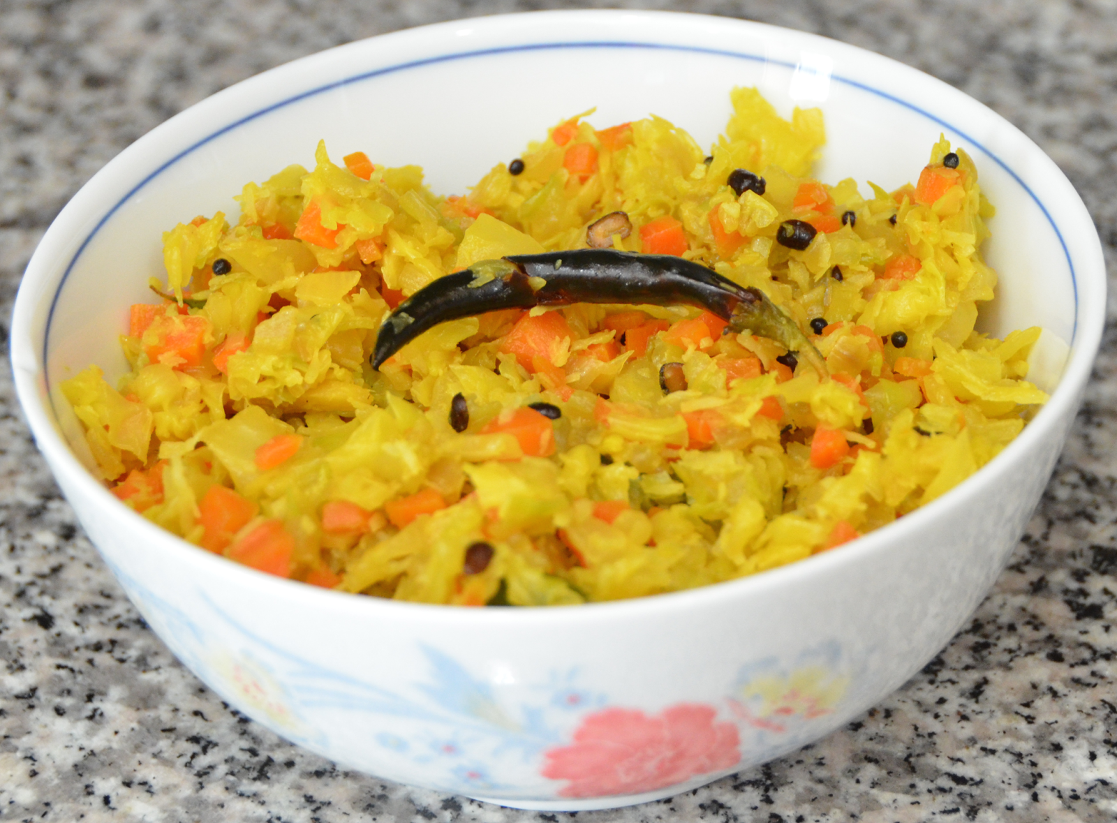 Add cabbage, carrot, saute for a minute, add water, mix well, close the pan and cook for 5 minutes. Open the pan and cook for 5 more minutes. Switch off the stove.